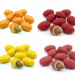 Amêndoas cobertas com chocolate branco e sabores a: laranja, limão, framboesa e morango.