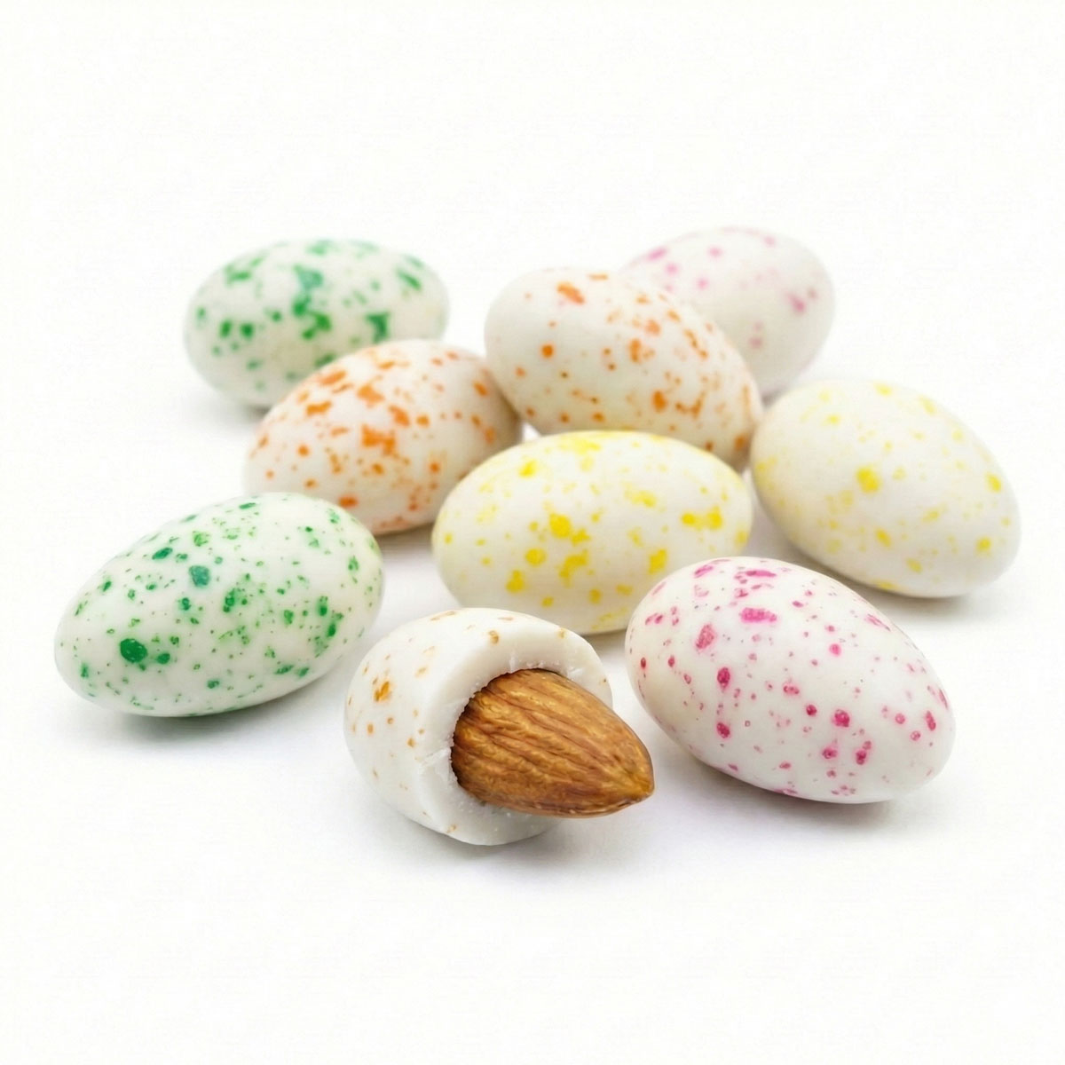 – 250gr de amêndoas cobertas com chocolate branco e sabores de riccota e pêra, pêssego, coco, morango e pistachio.