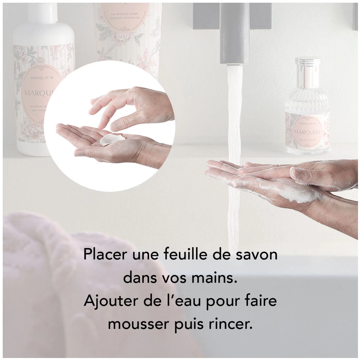– Refinadas e elegantes, estas folhas de sabão transformam-se numa espuma agradável ao contacto com a água, deixando as suas mãos delicadamente perfumadas.