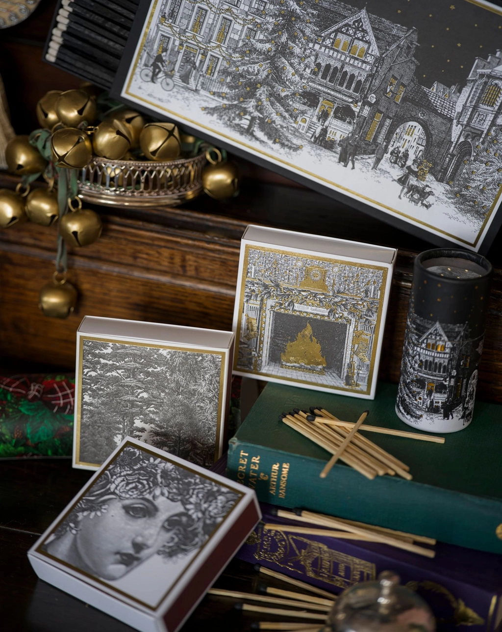 – A nossa caixa de fósforos quadrada exclusiva, com uma cena natalícia numa aldeia nevada à noite, com estrelas douradas no céu.