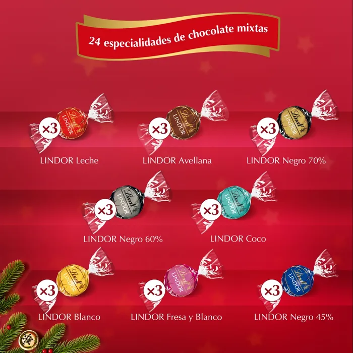 – Contém chocolates LINDOR nos sabores Leite, Morango, Avelã, Coco, Chocolate Negro 45% e Chocolate Branco.