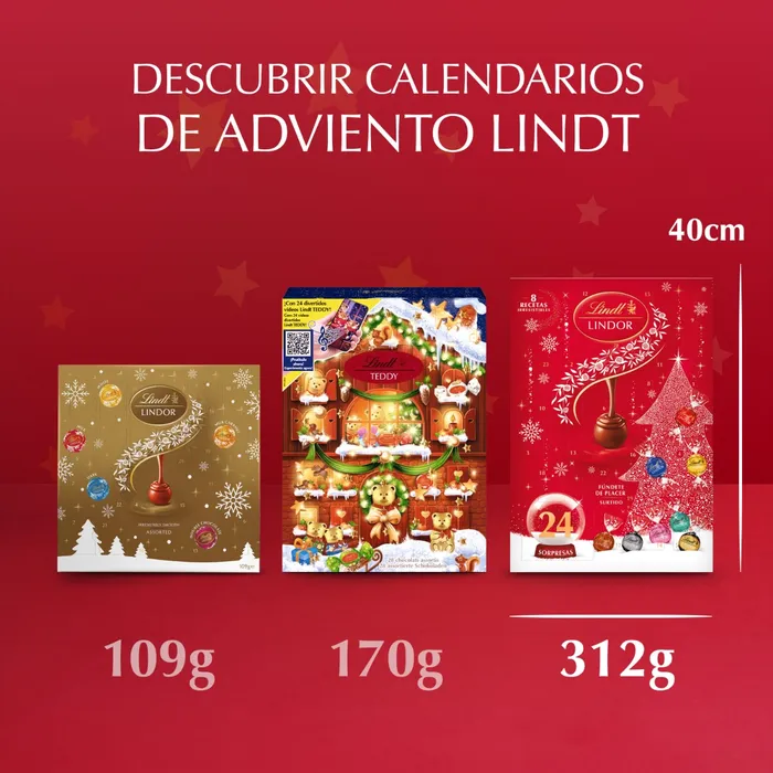 – Cada janela contém um bombom Lindor, para ir experimentando ao longo do mês mais bonito do ano! É o maior calendário Lindt, com 40cm.