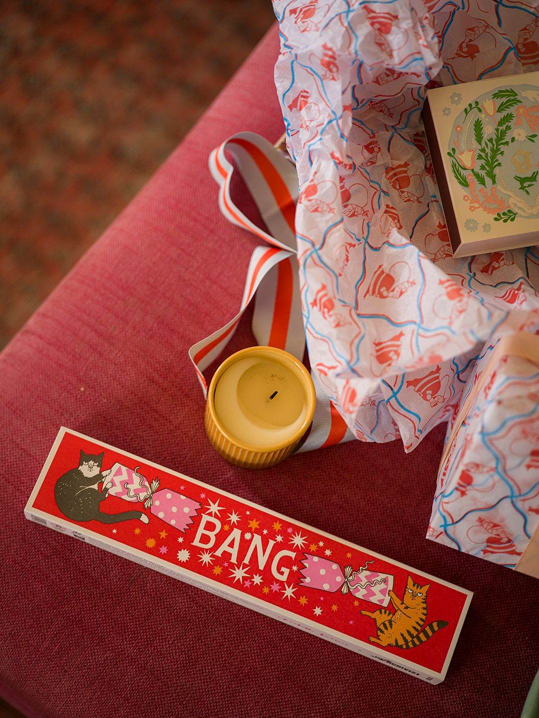 – A nossa caixa de fósforos comprida, com dois gatos a puxar um estalinho de Natal cor-de-rosa com a palavra “BANG” no meio, sobre um fundo vermelho.