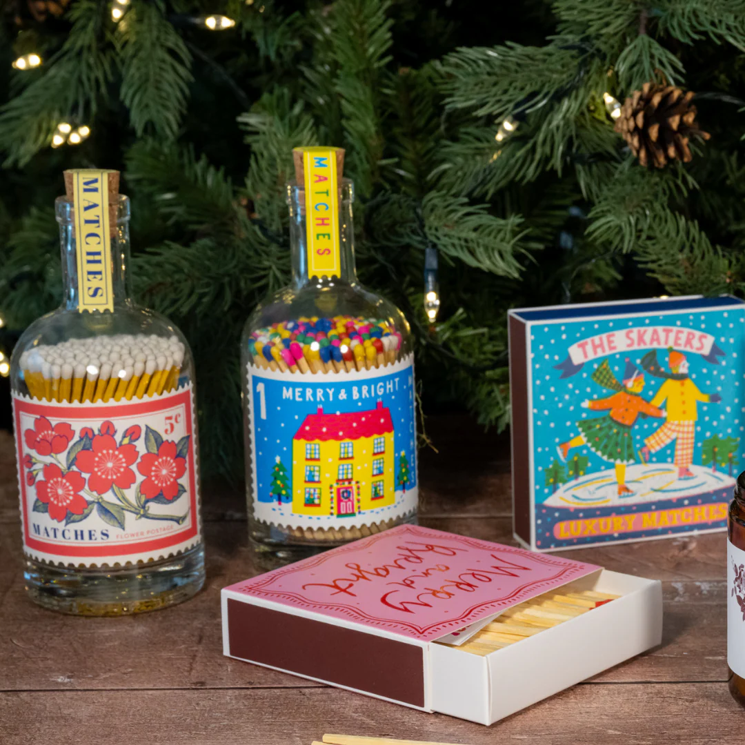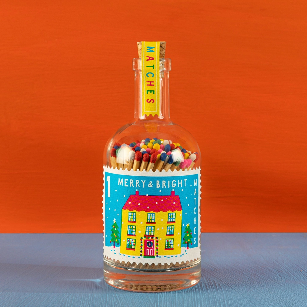 – O nosso frasco de fósforos apresenta um rótulo inspirado nos selos antigos, mostrando uma casa amarela decorada para o Natal, rodeada de neve, com a frase “Merry & Bright”.