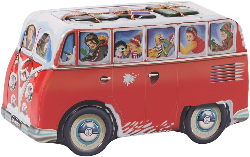 – Lata em forma de carrinha de campismo em tons vermelhos.