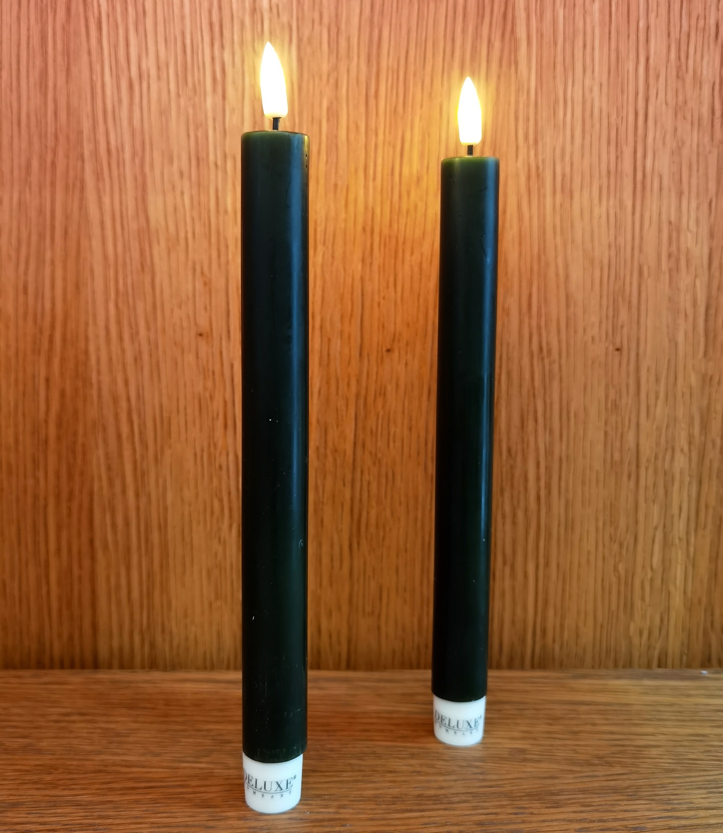 – Pack 2 Velas Led Verde Escuro: 24cm X 2.2cm, um verde bem escuro!