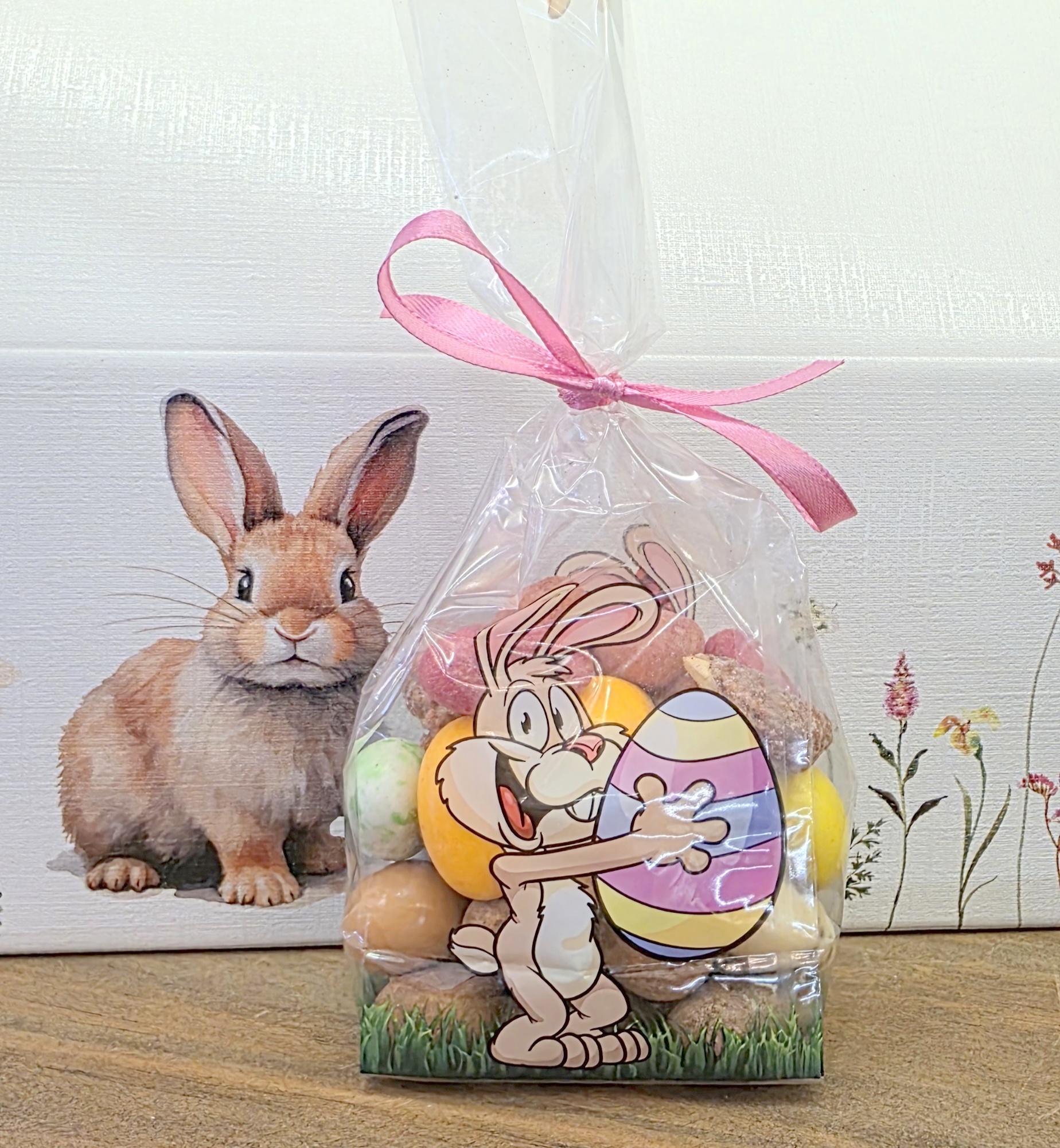 – Vendido em saco com coelhinhos transparente com laçarote.