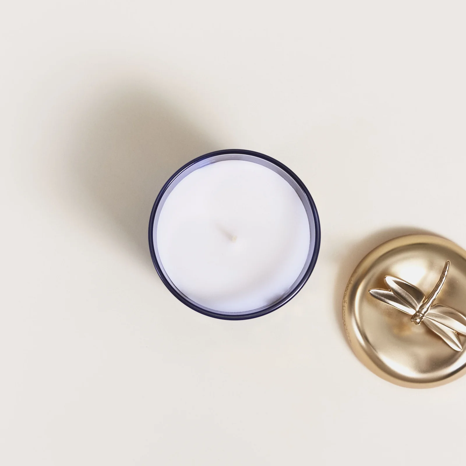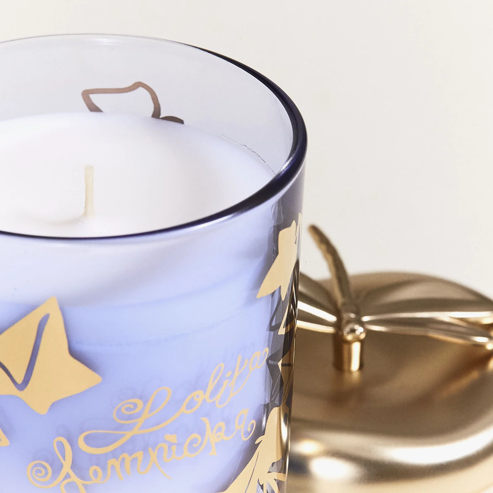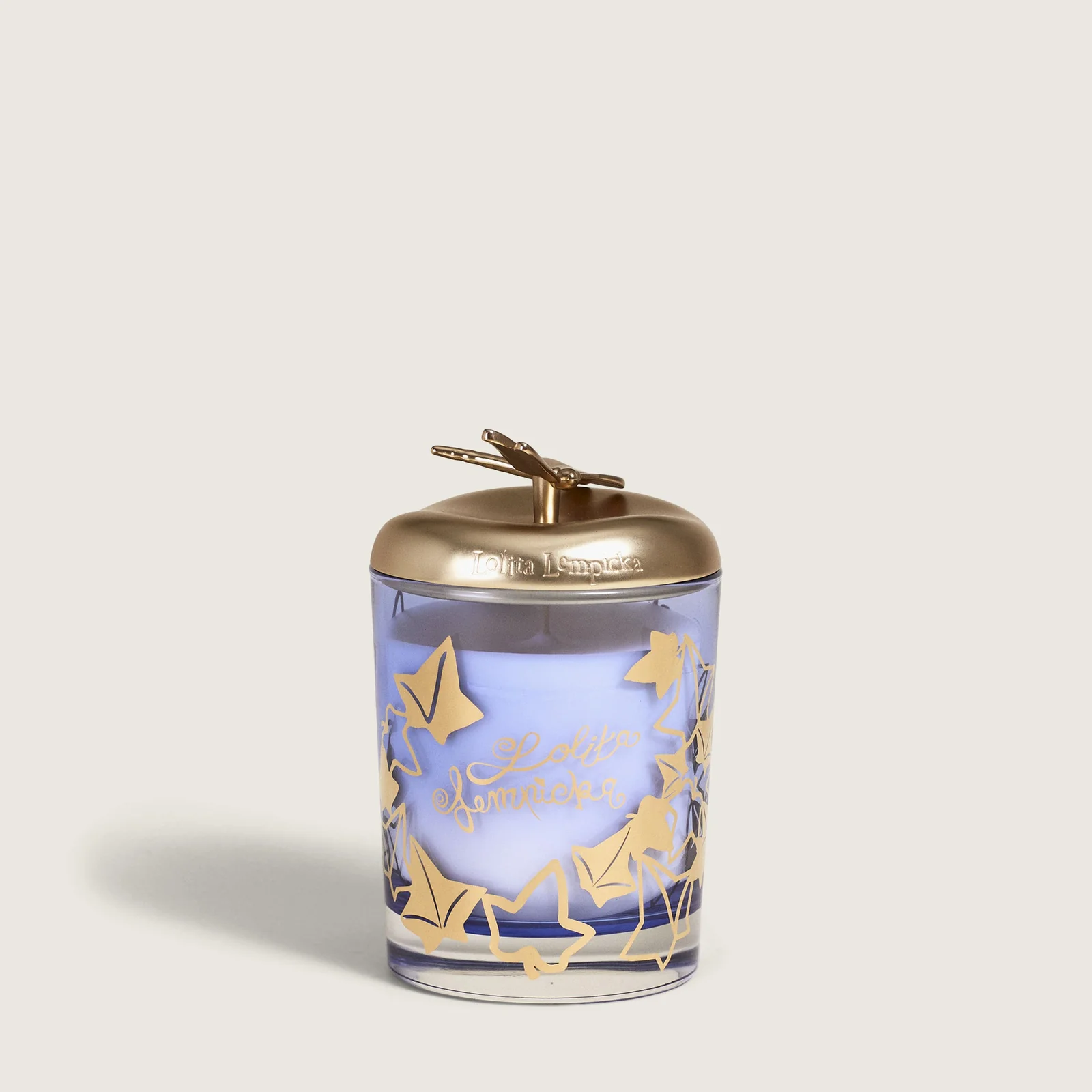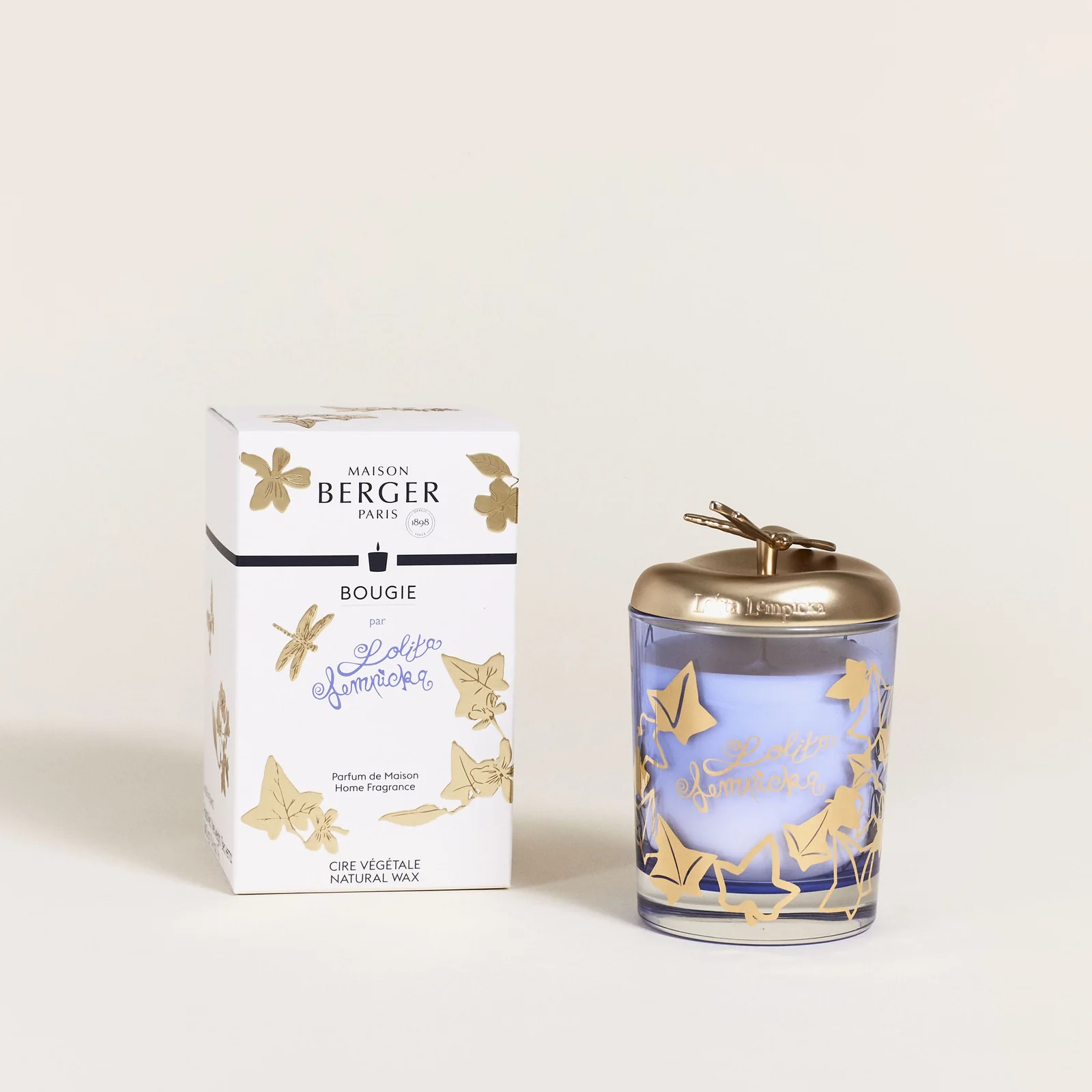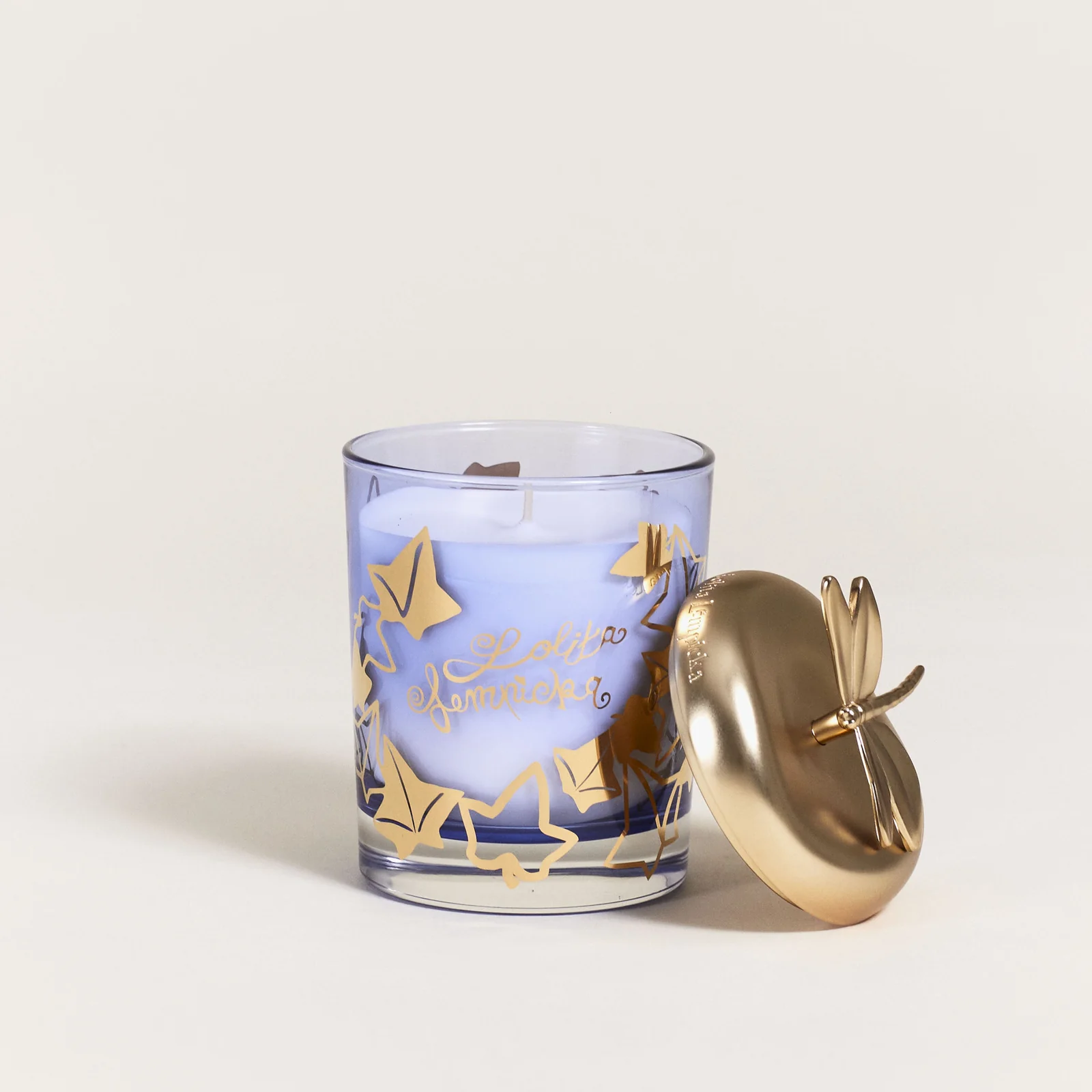 – A vela é em vidro colorido lilás, a tampa icónica da marca em metal dourado.
